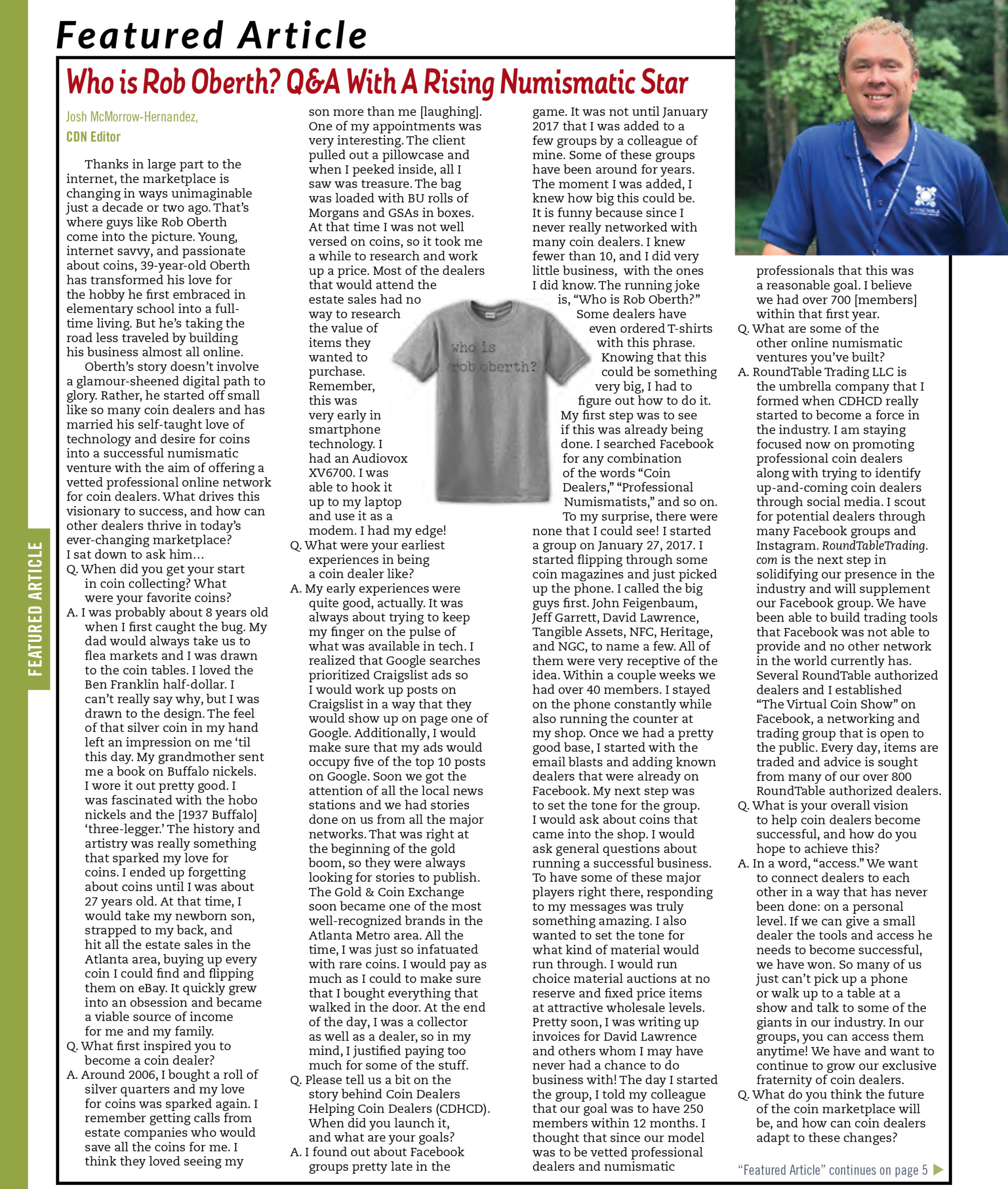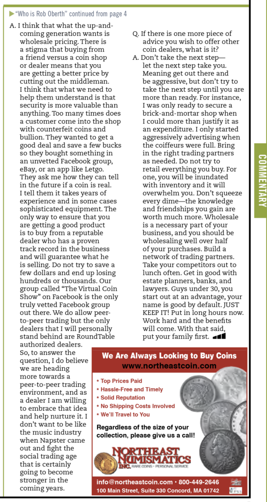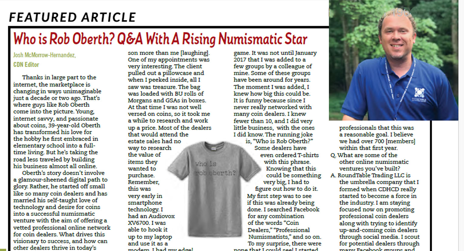 September 1, 2018 – Thanks in large part to the internet, the marketplace is changing in ways unimaginable just a decade or two ago. That’s where guys like Rob Oberth come into the picture. Young, internet savvy, and passionate about coins, 39-year-old Oberth has transformed his love for the hobby he first embraced in elementary school into a full-time living. But he’s taking the road less traveled by building his business almost all online.